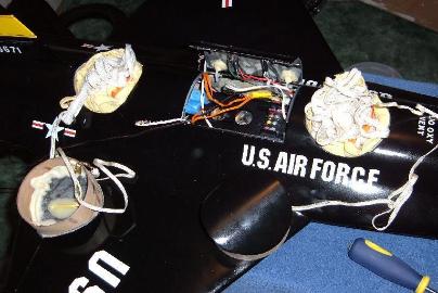 A Futaba seven channel receiver provides control to the servos and two Jomar E-switches utilized to initiate air start of two Aerotech E-25 motors and to deploy two 72" parachutes. One channel is utilized to open a ballast dump valve which dumps one pound of water ballast from the nose cone as the rocket nears maximum altitude and arcs over to transition into the glide recovery mode. A steep spiraling glide angle is utilized to aim the rocket back towards the launch area. At around 400' AGL two large 72" parachutes are deployed by remote control to gently lower the model back to the earth near the launch site.