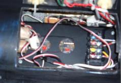 Above: Avionics compartment. Two red arm Jomar E-switch LEDS visible through clear round windows.